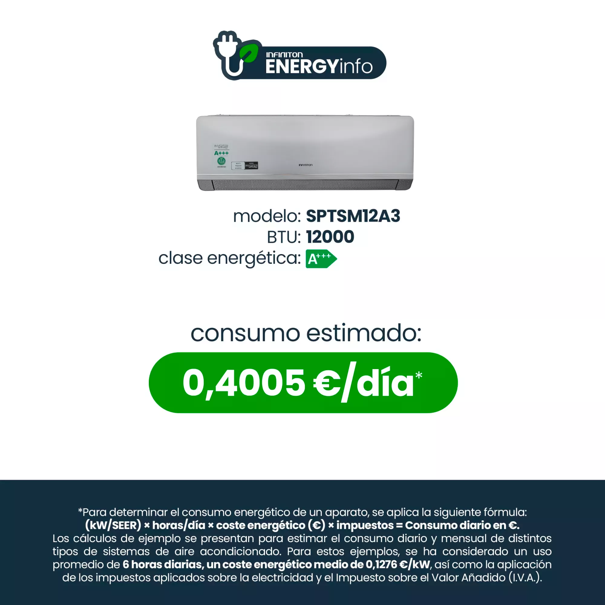 El aire acondicionado Infiniton SPTSM12A3 dispone de una potencia de frio de 3000 Frigocalorías.Gracias a su clasificación energética A+++ percibirás un importante ahorro energético en tu factura de la luz.