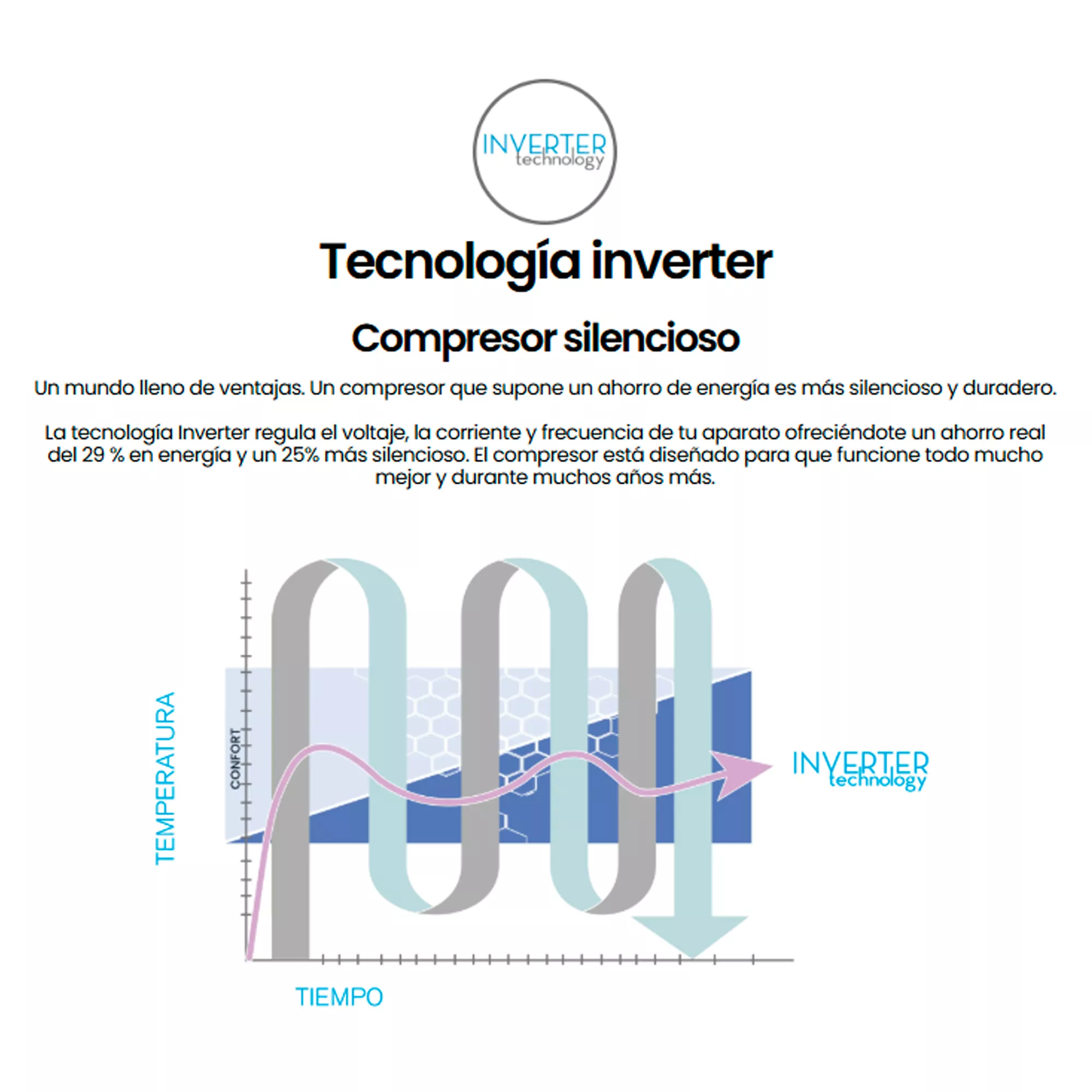 La tecnología Inverter regula el voltaje, la corriente y frecuencia de tu aparato ofreciéndote un ahorro real del 29 % en energía y un 25% más silencioso. El compresor está diseñado para que funcione todo mucho mejor y durante muchos años más.