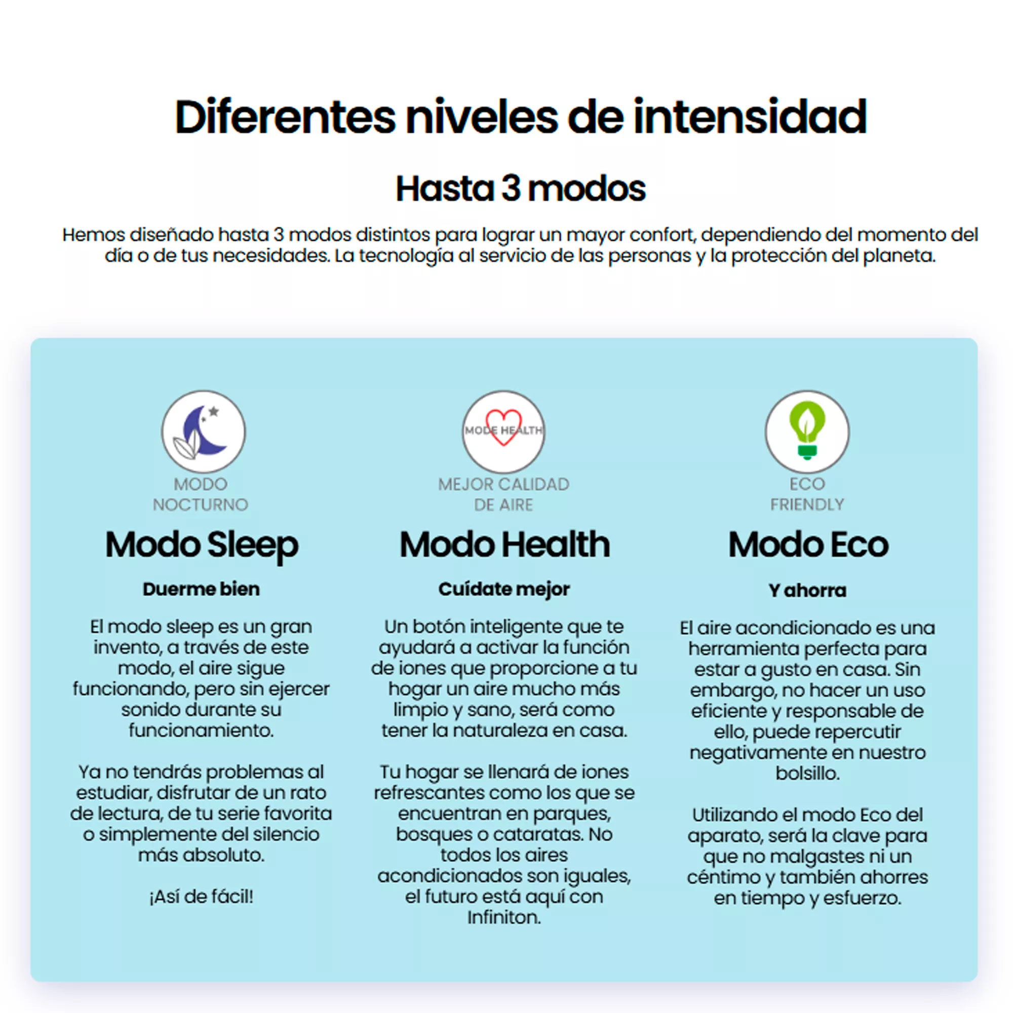 Hemos diseñado hasta 3 modos distintos para lograr un mayor confort, dependiendo del momento del día o de tus necesidades. La tecnología al servicio de las personas y la protección del planeta.