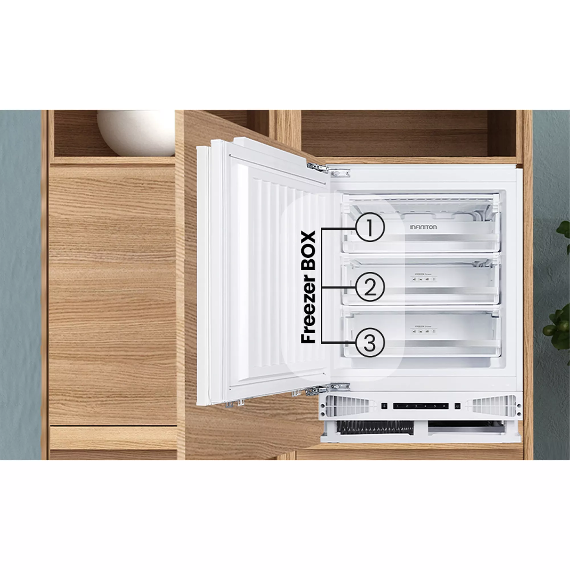 Con el congelador vertical, dispondrás de tres cajones perfectamente distribuidos, adaptándose a todas tus necesidades. Para conservar en cada cajón un tipo en concreto de comida. Así es Infiniton, simple y fácil.