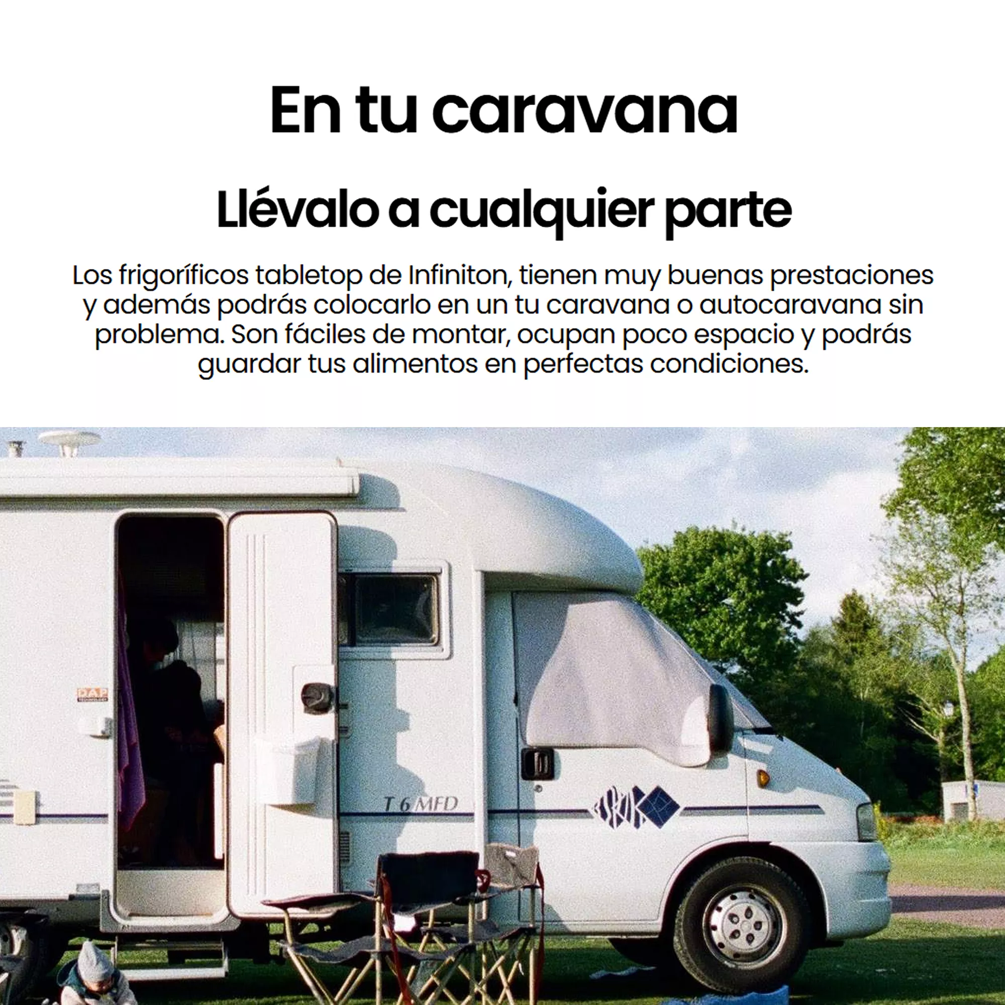 Los frigoríficos tabletop de Infiniton, tienen muy buenas prestaciones y además podrás colocarlo en un tu caravana o autocaravana sin problema. Son fáciles de montar, ocupan poco espacio y podrás guardar tus alimentos en perfectas condiciones.