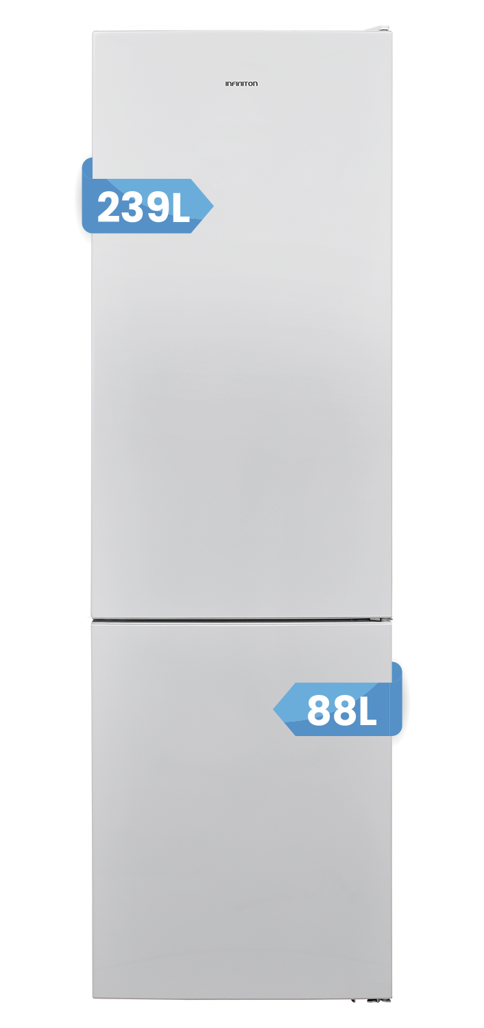 El frigorífico combi Infiniton FGC-327TD20WEF se caracteriza por tener una capacidad de 326 Litros. Gracias a su clasificación energética E percibirás un importante ahorro energético en tu factura de la luz.