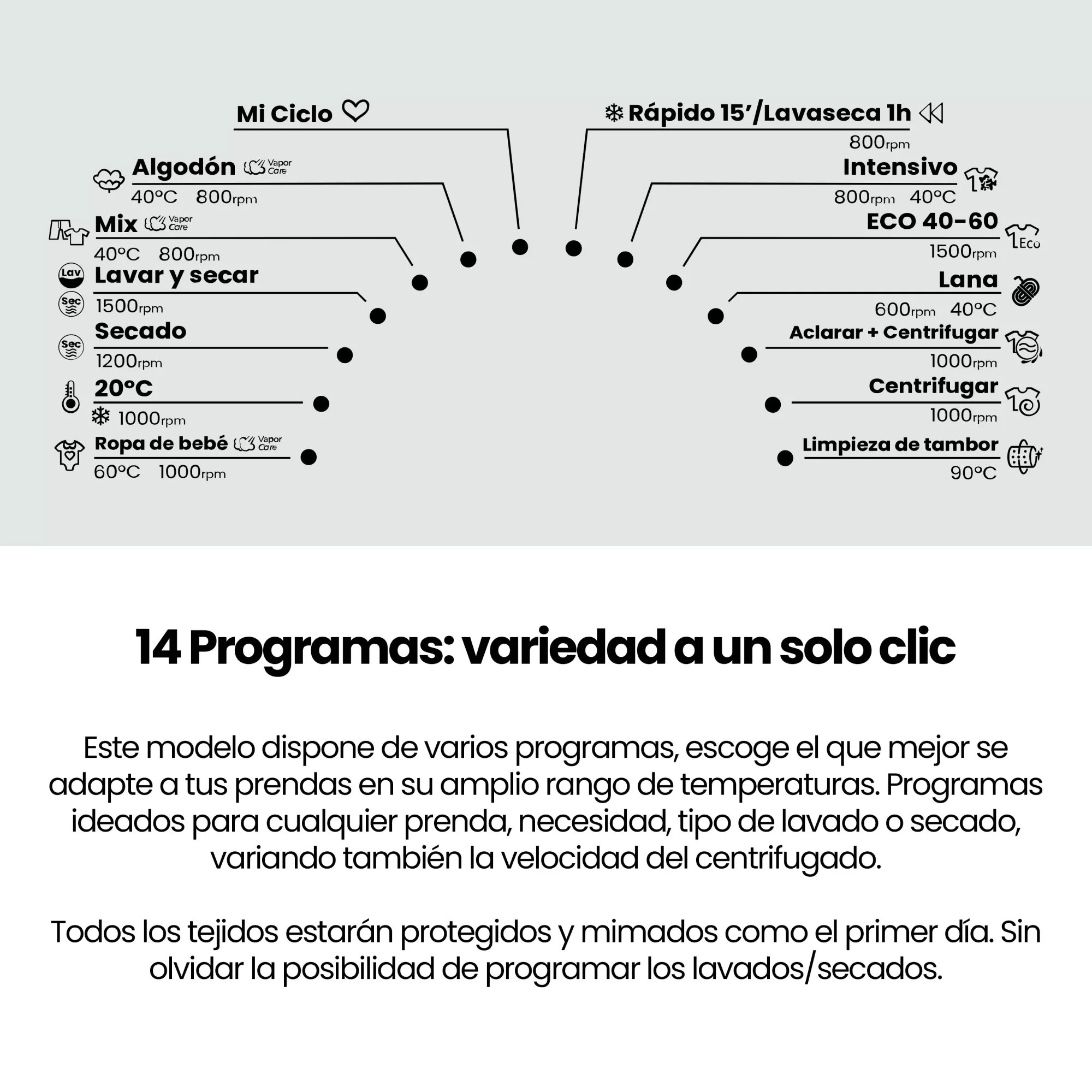 - 14 programas para: Escoger la temperatura idónea / Adaptarse al tipo de tejido / Variar la velocidad del centrifugado