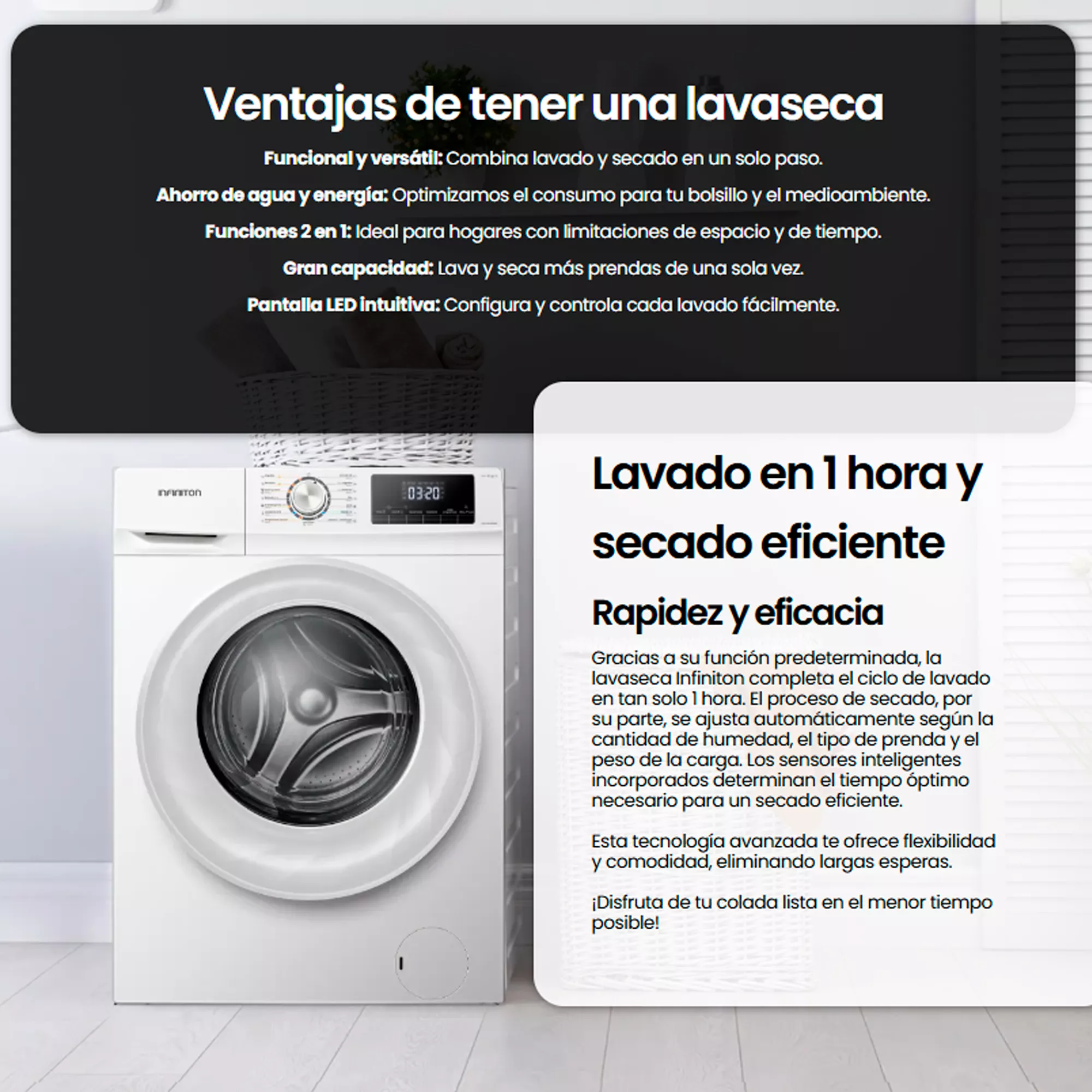 Tenemos la solución perfecta. Gracias a la lavaseca de Infiniton, disfrutarás de la comodidad y eficiencia de una lavadora y secadora en un solo electrodoméstico.