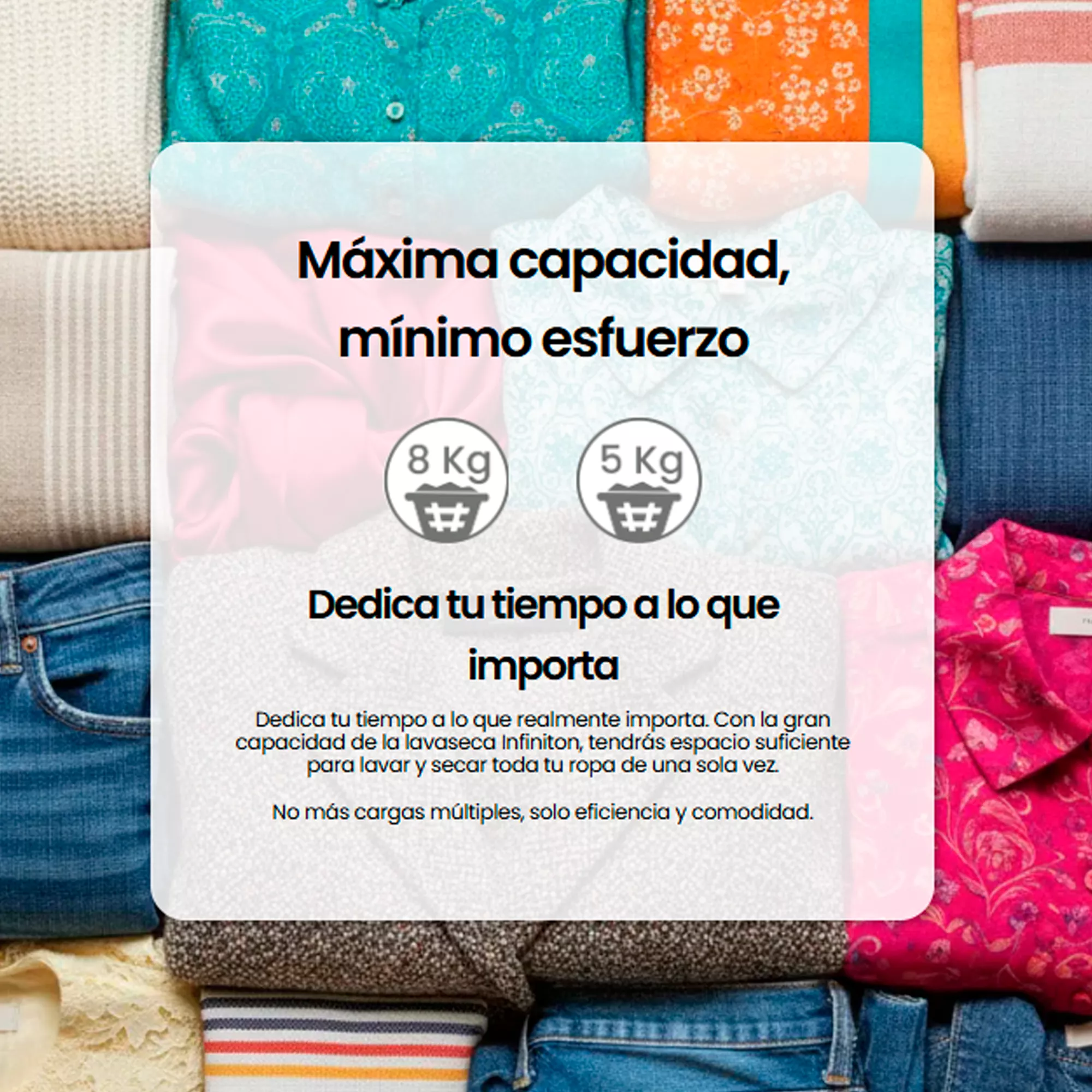 Dedica tu tiempo a lo que realmente importa. Con la gran capacidad de la lavaseca Infiniton, tendrás espacio suficiente para lavar y secar toda tu ropa de una sola vez.