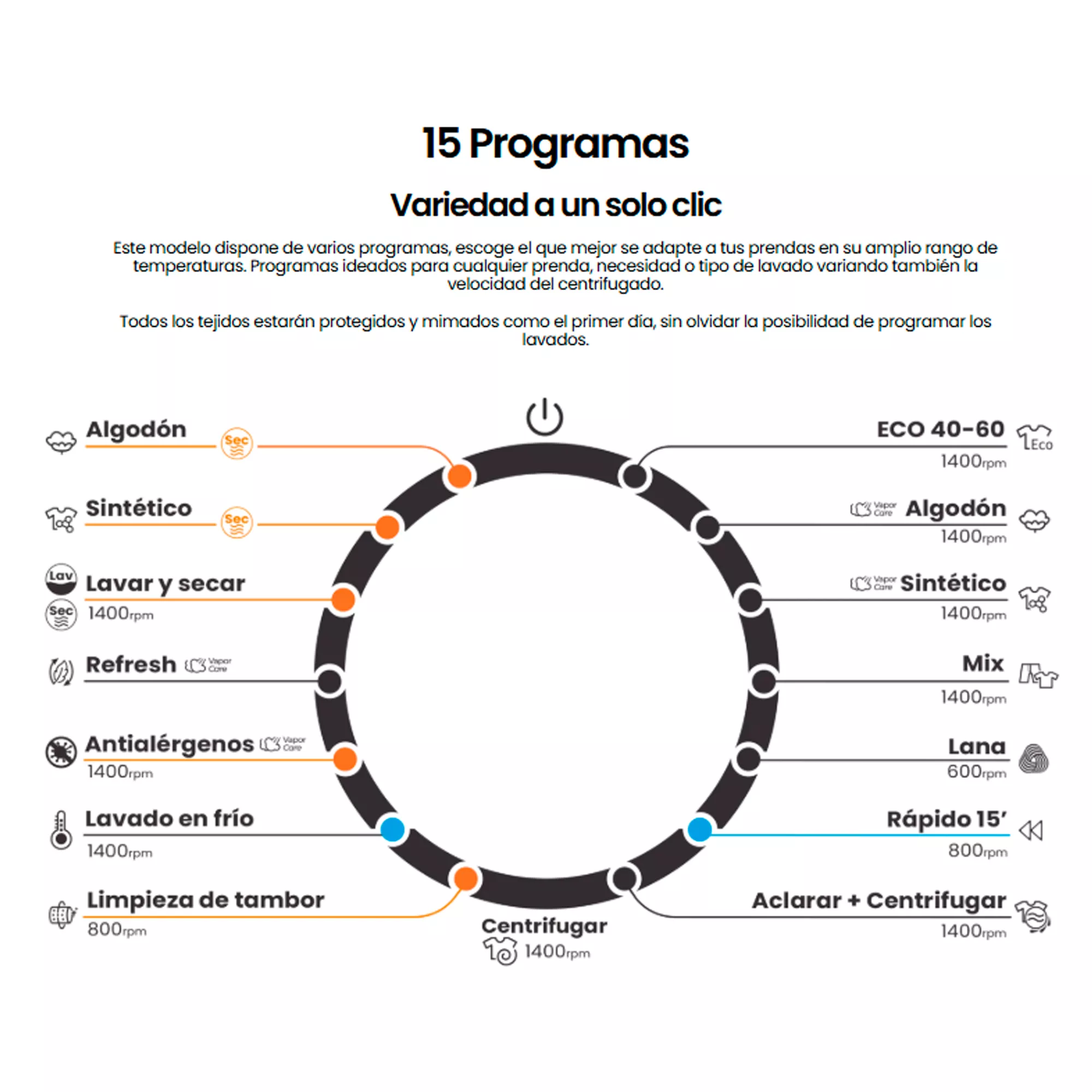 Este modelo dispone de varios programas, escoge el que mejor se adapte a tus prendas en su amplio rango de temperaturas. Programas ideados para cualquier prenda, necesidad o tipo de lavado variando también la velocidad del centrifugado.